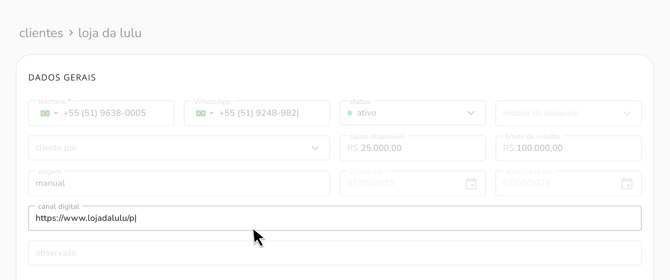 novo campo de canal digital no cadastro de clientesadicionamos o campo de canal digital ao cadastro de clientes, onde é possível registrar o site institucional da loja, redes sociais ou qualquer outro canal online relevante, tornando o perfil do cliente mais completo e rico em informações.