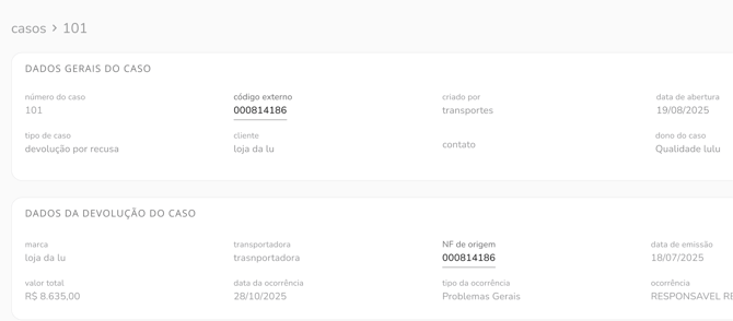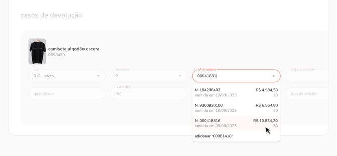vínculo da nota fiscal com caso de devoluçãopara marcas com integração de notas fiscais, ao criar um caso do tipo devolução, passamos a exibir automaticamente no campo de “nota fiscal de origem” uma lista de opções disponíveis, simplificando a seleção e evitando erros de digitação.como alternativa, caso a nota fiscal desejada não esteja listada, ainda é possível adicioná-la manualmente, como já ocorre hoje.