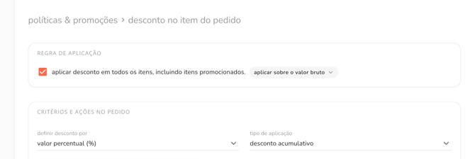 descontos acumulativos nas políticas e promoçõesadicionamos um novo tipo de aplicação na política de desconto no item que permite configurar se a aplicação será concorrente ou acumulativa, além de definir se o desconto incide sobre o preço cheio ou promocional do item, ampliando a flexibilidade para criar estratégias comerciais.
