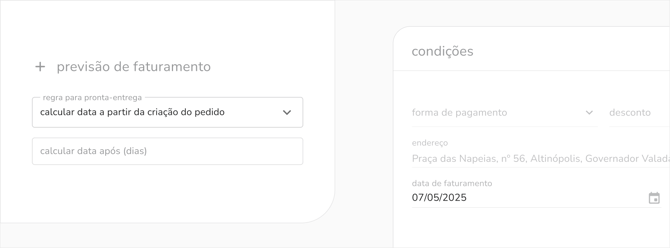 data de previsão faturamentoimplementamos configurações para definir a data estimada de faturamento de pedidos de pronta-entrega e pré-venda, permitindo que a data seja calculada automaticamente (a partir da criação do pedido ou das janelas de entrega) ou inserida manualmente, o que serve como base para o planejamento da marca e facilita a organização do fluxo de produção e faturamento.